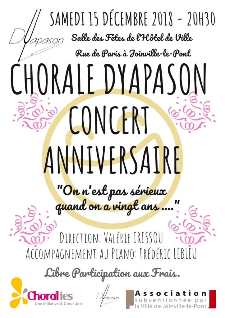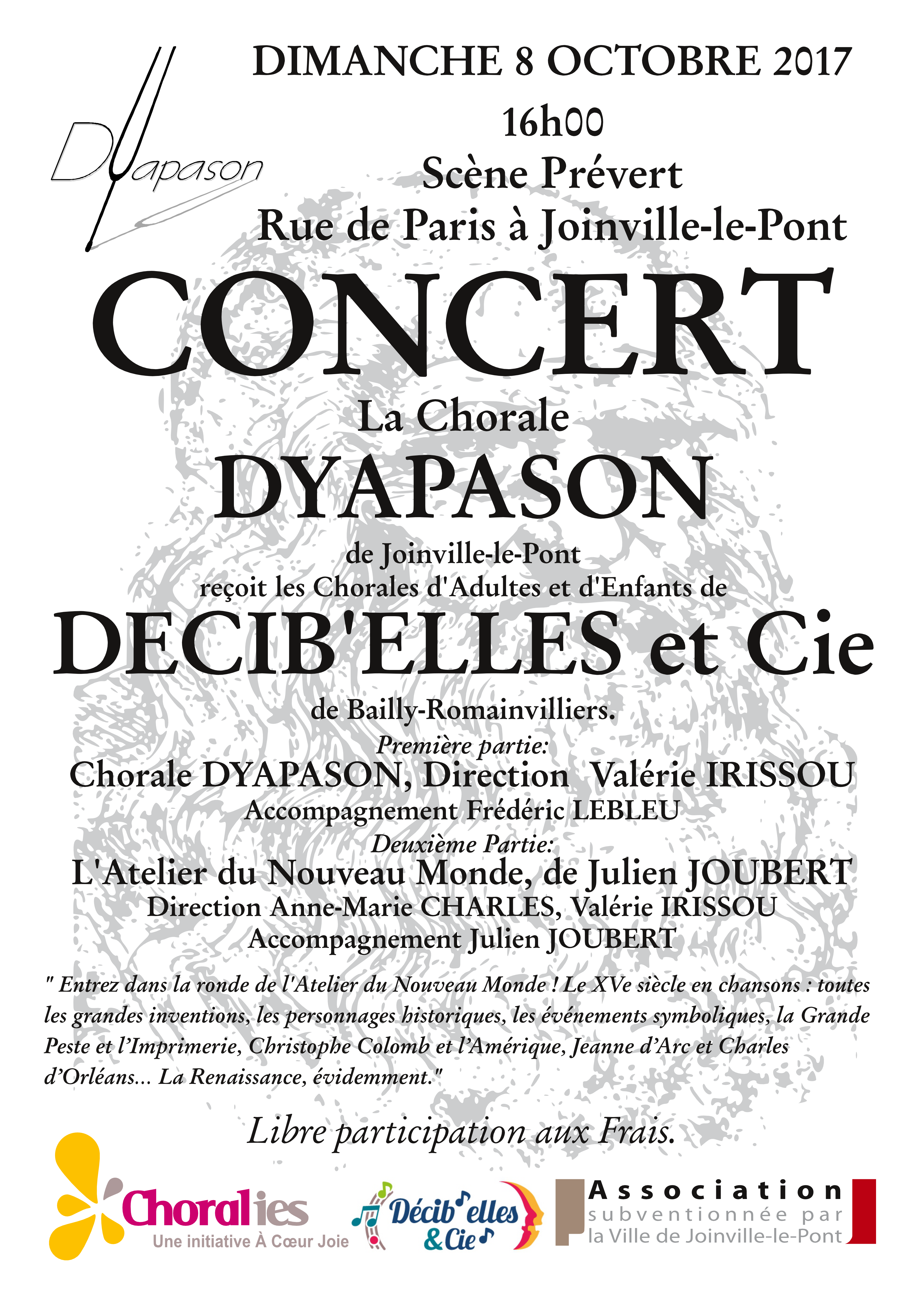 La Chorale DYAPASON fait concert commun avec les Chorales d’Adultes, de Jeunes et d’Enfants de Décib’elles et Cie de Bailly-Romainvilliers le 8 octobre 2017 à 16h00, à la Scène Prévert, rue de Paris à Joinville-le-Pont.